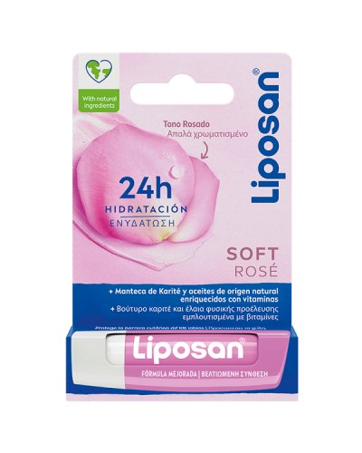 LIPOSAN SOFT ROSE Liposan Soft Rosé Lip Balm παρέχει 24h φροντίδα και ενυδάτωση χαρίζοντας ένα απαλό ροζ χρώμα. Η βελτιωμένη vegan σύνθεση του περιέχει βούτυρο Καριτέ βιώσιμης προέλευσης* και έλαια φυσικής προέλευσης με βιταμίνες. Το Liposan φροντίζει τα χείλη και σέβεται το περιβάλλον. Το Liposa..